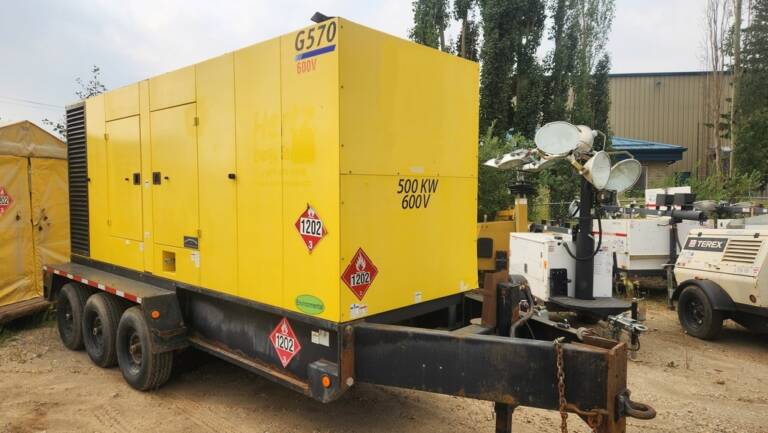 2012 Doosan G570 Mobile Diesel Generator Set. Comes rated for 600V, 60Hz, 3 phase, 1800RPM. Digital control panel, weather proof enclosure, on a triple axle.