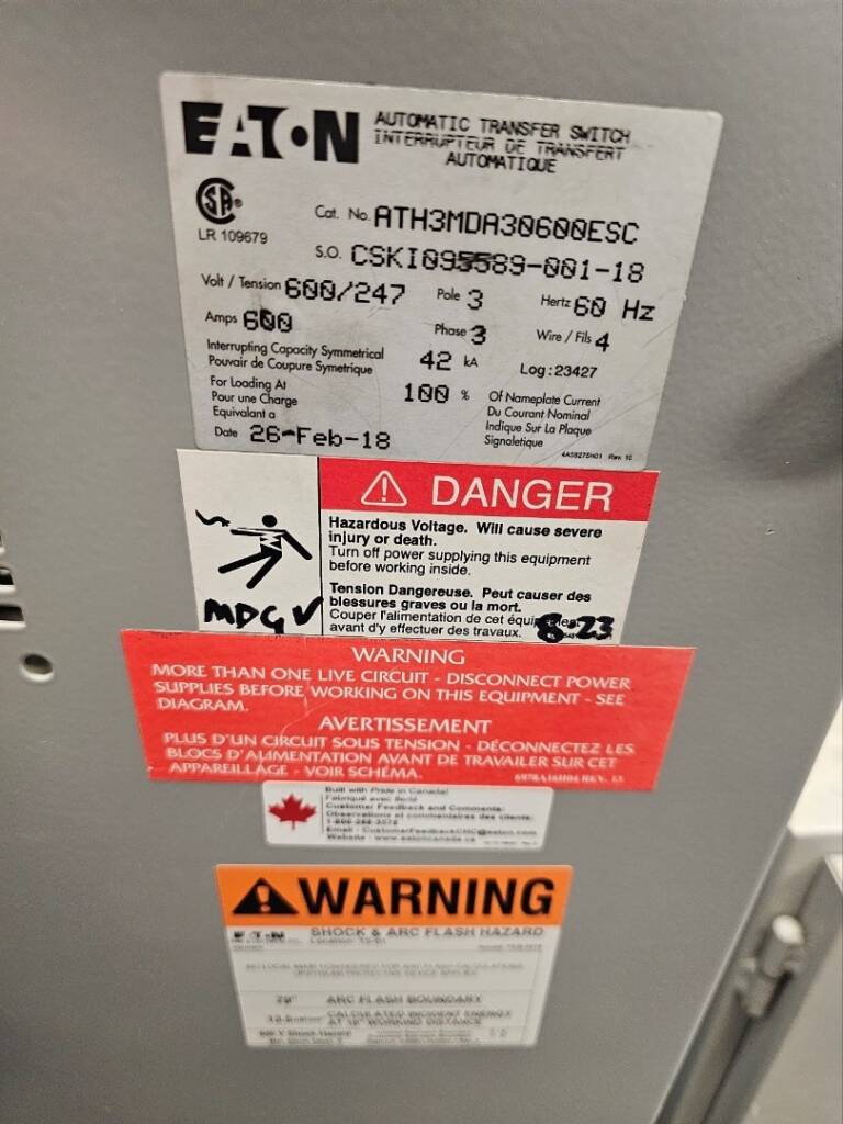 Used Year 2018 EATON Automatic Transfer Switch, CAT No: ATH3MDA30600ESC 600A, 600V, 60Hz, 3-Pole, 3-Phase, 4W, 42kA (suitable for a 600kW generator) EATON ATC 300 Controller, Nema-1 (indoor rated), CSA Certified