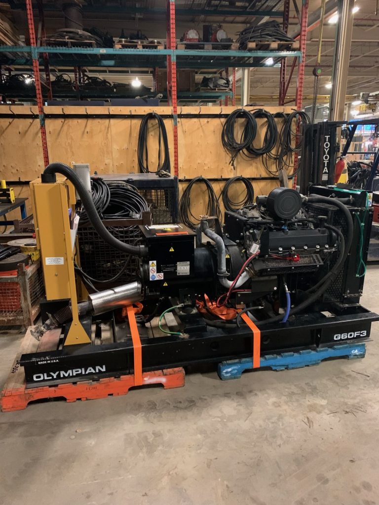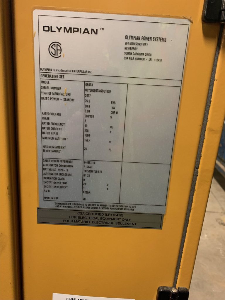 One CAT Olympian Model G60F3 60kW Standby, 120/208V Natural Gas Generator Set w/ circuit breaker , CAT Control panel, load tested and serviced in great condition.